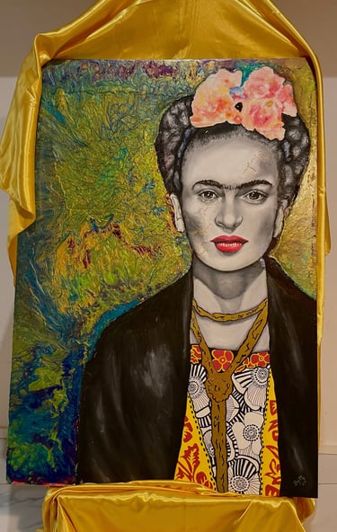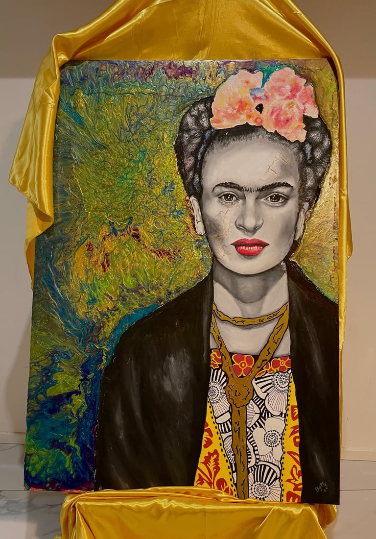 A MATERIAL PORTRAIT OF FRIDA KAHLO THAT MERGES FLUID PAINTING AND CRAQUELÉ, WHERE THE CRACKS ON THE FACE OF THIS ICONIC WOMAN CELEBRATE THE POWER OF HER LIFE EXPERIENCE.
