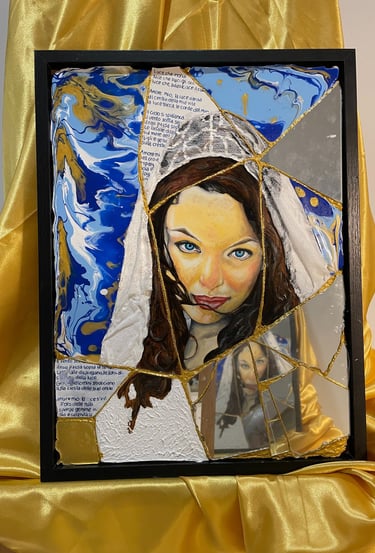 WORDS ARE HER FORM OF HEALING, AND THE MIRROR FRAGMENTS REFLECT AND INVITE YOU TO SEE YOURSELF IN THAT DEEP BLUE — A COLOR OF LISTENING, BREATH, AND PROTECTION.